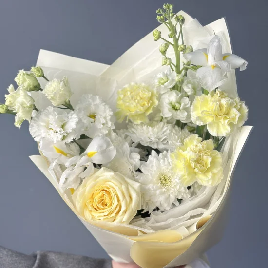 Свежесть первых весенних дней передают нежные оттенки белого, кремового и зеленого. Легкие соцветия нарциссов и воздушная статица создают ощущение пробуждения природы, а бархатистые розы и хризантемы добавляют благородную глубину. Композиция словно наполнена солнечным светом и тонким ароматом.