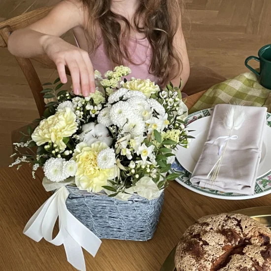 Нежные пастельные тона переплетаются с натуральными фактурами – воздушный хлопок контрастирует с плотными бутонами, а сухоцветы добавляют графичности. Композиция напоминает солнечный весенний луг, где каждая деталь сохраняет естественную легкость.