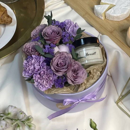 Подарочный набор в шляпной коробочке, состоящий из стойкого цветочного набора пионовидных роз, стойких гвоздик, веточек статицы, эвкалипта, соцветий хлопка и ароматной соевой свечи - стильный и приятный сюрприз, который запомнится надолго!Диаметр композиции - 19см