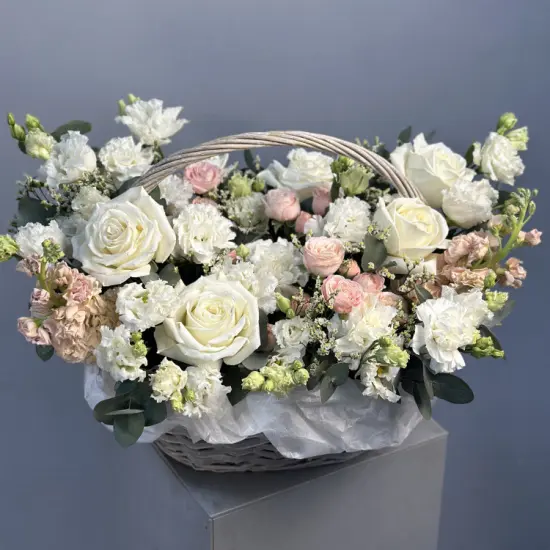 Трепетная и нежная цветочная композиция, выполненная из россыпи пионовидных роз, веточек нежной эустомы, фактурного лимониума, медовой маттиолы и свежей зелени в плетеной корзине, поможет выразить ваши нежные чувства или слова благодарности!Ширина пышной цветочной корзины - около 55 см