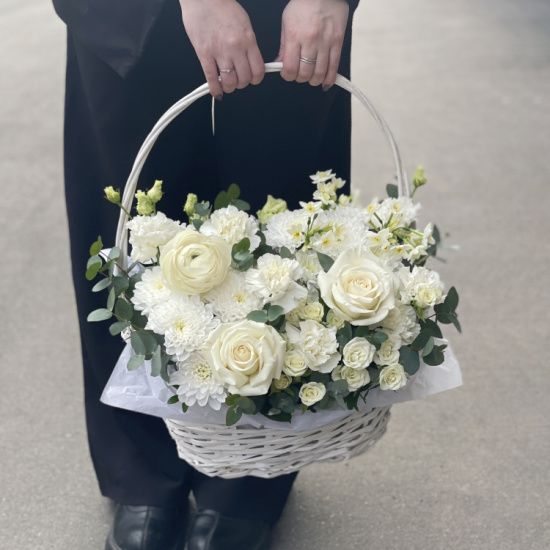 Мягкие переливы розовых и белых лепестков перекликаются с сочной зеленью, напоминая о первых весенних днях. Воздушные бутоны эустомы и пышные головки пионов добавляют объем, а тонкий аромат нарциссов завершает образ – кажется, будто в корзину случайно попали цветы из сада.