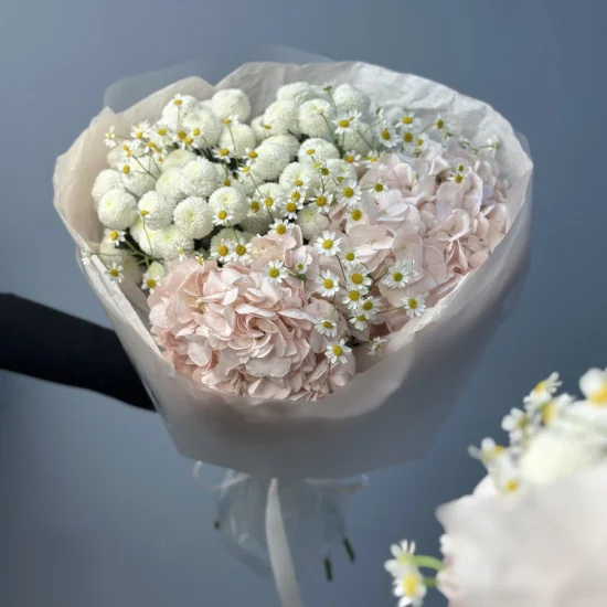Свежесть луговых цветов, игра фактур и оттенков – от нежно-белого до насыщенного розового – напоминают о летнем разнотравье. Легкость и объем композиции передают ощущение свободы, будто букет только что собран на солнечной поляне.