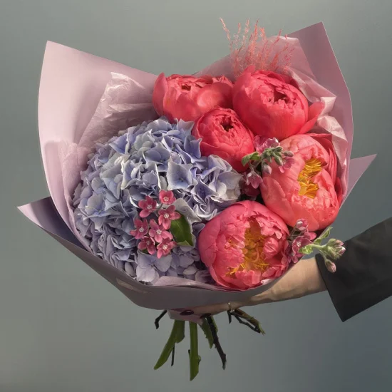 Сборный букет Эмили - воздушный букет, составленный из крупных сезонных пионов, гортензий, твидии и мискантуса.Размер сборного букета Эмили - около 45-50 см