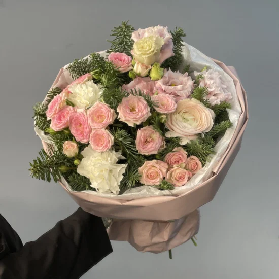Зимняя свежесть хвои сочетается с нежностью розовых и белых бутонов, создавая атмосферу уюта и праздника. Глубокие оттенки зелени и пастельные тона цветов напоминают о морозном утре, где каждая деталь продумана до мелочей. Букет выглядит одновременно сдержанно и выразительно – без лишней вычурности, но с безупречным вкусом.