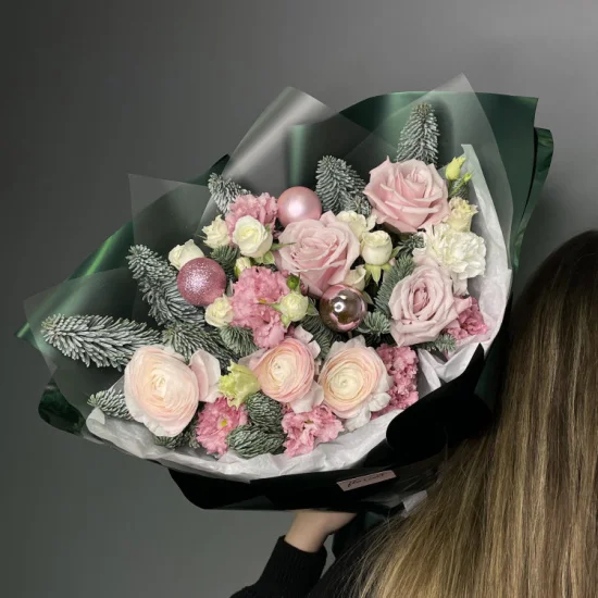 Мягкие пастельные оттенки лепестков переплетаются с хвойными ветвями, создавая ощущение свежести и уюта. Воздушные соцветия и нежные линии зелени напоминают о первых снежинках, а теплые акценты декора добавляют нотку праздничного волшебства.