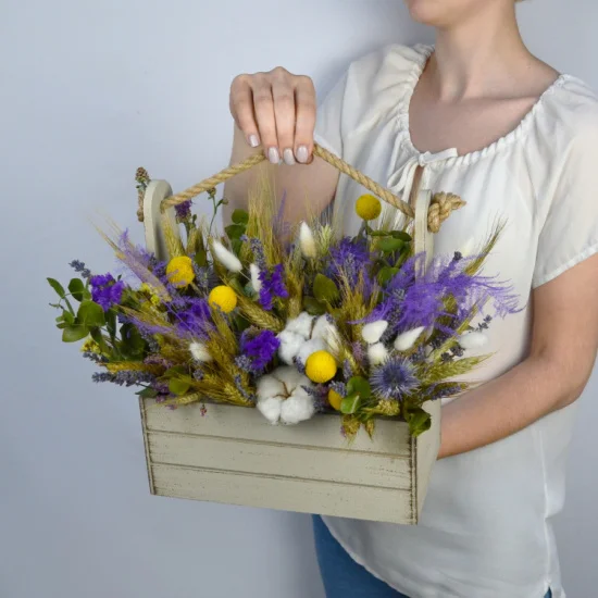 Интерьерная композиция из сухоцветов в ящичке, собранная на флористической губке - стойкое и стильное украшение интерьера, готовое украшать пространство долгие месяцы. В составе: пшеница, хлопок, лагурус, аспарагус, краспедия, зелень.Размер композиции в ящичке - около 40 см