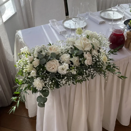 Раскидистая композиция для украшения стола молодоженов, составленная из крупных роз, эустомы, фактурной зелени и гипсофилы.Композиция выполнена на флористическом поддоне. Размер композиции - 45-50 см 11060