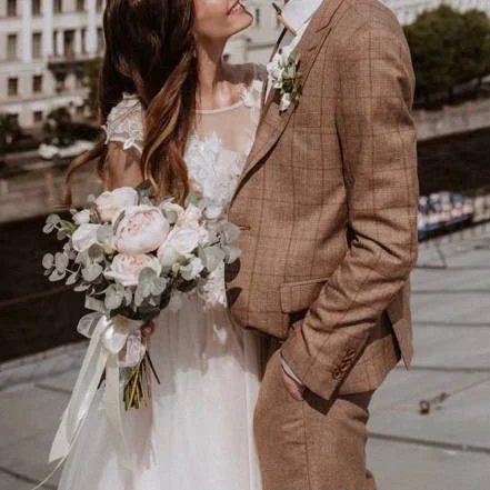 Букет словно впитал в себя свежесть утреннего сада – нежные лепестки эустомы переплетаются с пышностью пиона, а зелень эвкалипта добавляет природной грации. Такой акцент в руках невесты создает ощущение легкости и гармонии, превращая свадебный день в историю, наполненную теплом и искренними эмоциями.