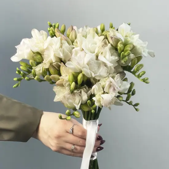Легкие фрезии словно танцуют в воздухе, наполняя свадебный день ощущением свежести и чистоты. Их нежные лепестки переливаются на свету, создавая мягкий, почти воздушный акцент в руках невесты. Такой букет становится не просто украшением, а частью атмосферы – тонкой, трогательной и наполненной светом.