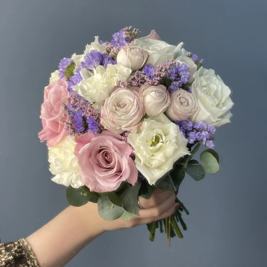 Свадебный букет невесты, в составе которого использованы нежные сортовые розы, шарики эустомы, воздушная статица, лимониум и веточки эвкалипта, исполнен в классическом стиле. На фото - пример свадебного букета, который наши опытные флористы исполнят для Вас с любыми изменениями бюджета, состава, цветовой гаммы и размера, чтобы улыбка на Вашем лице сияла на протяжении всего торжества. Также мы с радостью подберем подходящую по стилю бутоньерку, которая дополнит образ Вашей красивой пары.Мы понимаем, что свадьба - особенный день, который должен пройти идеально. Часть Вашей предсвадебной подготовки, а именно создание совершенного букета, мы берем на себя.