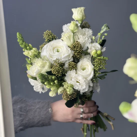 Свадебный букет невесты, в составе которого использованы нежные ранункулюсы, эустома, скиммия, антирринум, фрезия и маттиола, исполнен в современном стиле. На фото - пример свадебного букета, который наши опытные флористы исполнят для Вас с любыми изменениями бюджета, состава, цветовой гаммы и размера, чтобы улыбка на Вашем лице сияла на протяжении всего торжества. Также мы с радостью подберем подходящую по стилю бутоньерку, которая дополнит образ Вашей красивой пары.Мы понимаем, что свадьба - особенный день, который должен пройти идеально. Часть Вашей предсвадебной подготовки, а именно создание совершенного букета, мы берем на себя.