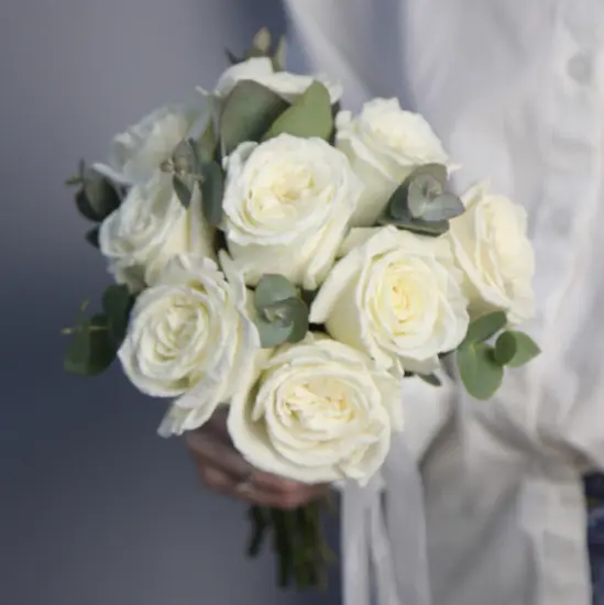 Розы Playa Blanca с их мягким сиянием и эвкалипт с серебристым отливом создают ощущение свежести и элегантности – такой букет словно излучает нежность и чистоту, становясь важным акцентом свадебного образа. Он не просто дополняет наряд невесты, но и задает тон всему торжеству, добавляя ему утонченности и гармонии. Каждый лепесток и изгиб веточки подчеркивают естественную красоту момента.