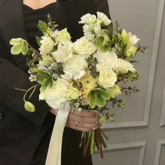 Свадебный букет невесты, в составе которого использованы утонченные ранункулюсы, хелеборус, ваксфлауэр, гвоздика и маттиола. На фото - пример свадебного букета, который наши опытные флористы исполнят для Вас с любыми изменениями бюджета, состава, цветовой гаммы и размера, чтобы улыбка на Вашем лице сияла на протяжении всего торжества. Также мы с радостью подберем подходящую по стилю бутоньерку, которая дополнит образ Вашей красивой пары.Мы понимаем, что свадьба - особенный день, который должен пройти идеально. Часть Вашей предсвадебной подготовки, а именно создание совершенного букета, мы берем на себя.