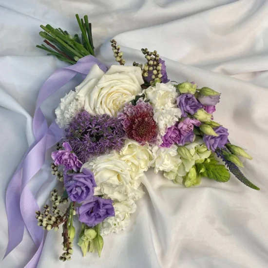 Букет создает атмосферу легкости и романтики – нежные лепестки роз перекликаются с графичными соцветиями аллиума, а полупрозрачные ветви стахиуруса добавляют воздушности. Такая композиция становится не просто аксессуаром, а частью свадебной истории, наполненной теплом и искренними эмоциями. Каждый элемент подобран так, чтобы подчеркнуть торжественность момента, сохраняя при этом естественную элегантность.