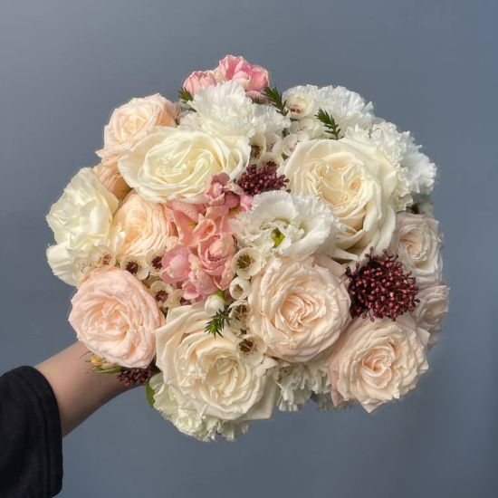 Легкость пионовидных роз и деликатная фактура хамелациума придают букету романтичное звучание, а сочные акценты гвоздики и эустомы добавляют глубину. Такой букет становится не просто аксессуаром, а частью свадебной атмосферы – он подчеркивает торжественность момента, сохраняя при этом естественную нежность.