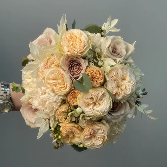 Мягкие переливы оттенков и фактур создают ощущение легкости и романтики – такой букет становится не просто аксессуаром, а частью свадебной атмосферы. Он подчеркивает торжественность момента, добавляя образу невесты утонченности и тепла. Каждый цветок в композиции словно наполнен светом, делая букет живым и запоминающимся.