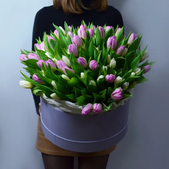 Изящный букет из 101 тюльпана в шляпной коробке - пышный весенний подарок. Тюльпаны - цветы, обладающие особым шармом. Букеты тюльпанов создают нежное весеннее настроение, их приятно дарить и получать!Букеты в шляпных коробках легко транспортировать, а также для них не требуется ваза, что делает такие букеты очень удобными и простыми в уходе!