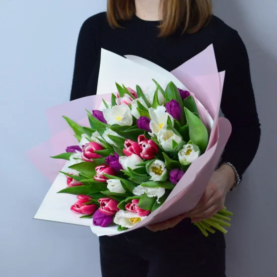 Букет из 51 пионовидного тюльпана разных цветов - пышный весенний подарок. Тюльпаны - хрупкие цветы, обладающие особым шармом. Букеты тюльпанов создают нежное весеннее настроение, их приятно дарить и получать!Тюльпаны очень красиво раскрываются, превращаясь из плотных бутонов в пышные цветки.