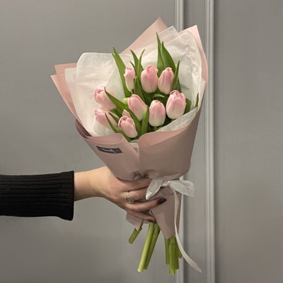 Нежные лепестки, постепенно раскрываясь, создают ощущение легкости и свежести. Розовый оттенок придает букету теплоту и мягкость, напоминая о первых лучах солнца после зимы. Простота формы и естественные линии передают гармонию природы – без лишней вычурности, но с изысканной лаконичностью.