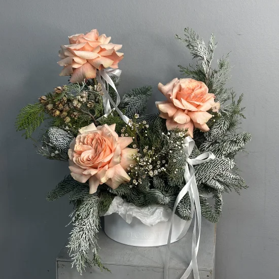Зимняя композиция, составленная из пионовидных роз Kahala, ароматной хвои, припушенной снегом, и стойкого хамелациума Размер композиции - около 30-40 см