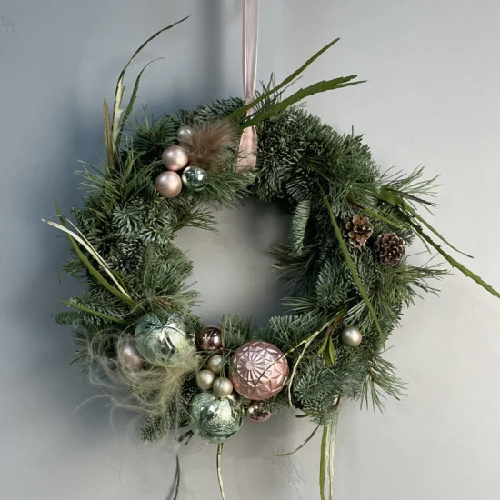 Мягкий хвойный аромат, переливы атласных лент и мерцание шаров создают атмосферу зимнего волшебства. Природная фактура еловых ветвей сочетается с нежными перьями, а контраст матовых шишек и глянцевых украшений добавляет динамики. Композиция выглядит уютно и нарядно – как часть сказочного декора.