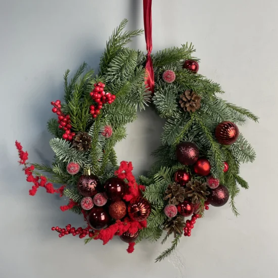 Алые акценты переплетаются с природными оттенками зелени, создавая ощущение уюта и праздничного настроения. Сочетание блестящих элементов и фактурных шишек придает композиции динамику, а мягкие линии аспарагуса добавляют легкость. Венок выглядит одновременно нарядно и естественно – как зимний лес, украшенный огнями.