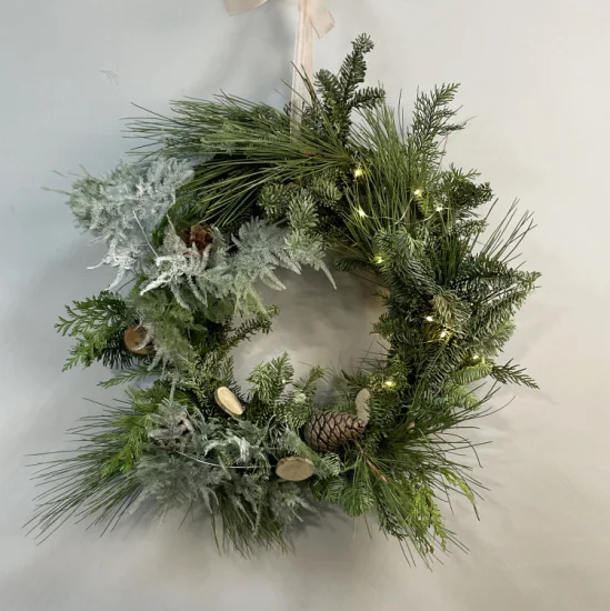 Стильный венок из гаммы Лес - натуральный, минималистичный, современный. Три вида ароматной хвои, еловые шишки, заснеженный аспарагус и уютная гирлянда в комплекте. Размер венка - около 40-45 см