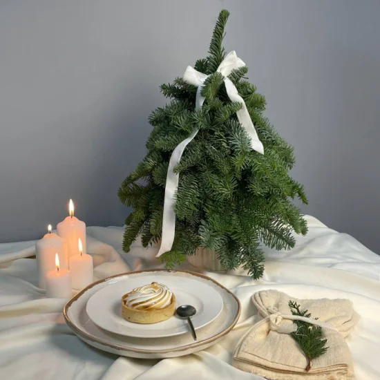 Ёлочка из ароматных веточек датской ели, декорированная бархатной лентой. Идеальна для любителей минимализма. Собрана в стильном белом кашпо.Размер ёлочки - около 40-40 см