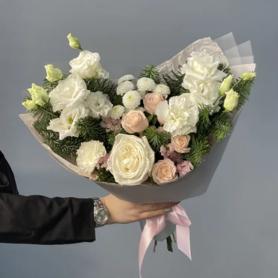 Мягкие оттенки розового, кремового и зелени создают нежную палитру, напоминающую морозные узоры на стекле. Текстура хвои и шелковистые лепестки дополняют друг друга, а округлые формы хризантем добавляют композиции объем и легкость.