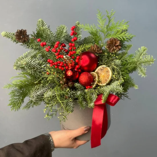 Очаровательная хвоя, яркие ягодки илекса и стильный новогодний декор в шляпной коробочкеРазмер композиции - около 40 см