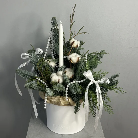 Сдержанная элегантность сочетает природную фактуру и мягкие оттенки: серебристо-зеленые иголки, белоснежные хлопковые коробочки, нежные соцветия хамелациума. Свеча добавляет атмосферу спокойствия – композиция словно вобрала в себя тишину заснеженного леса.