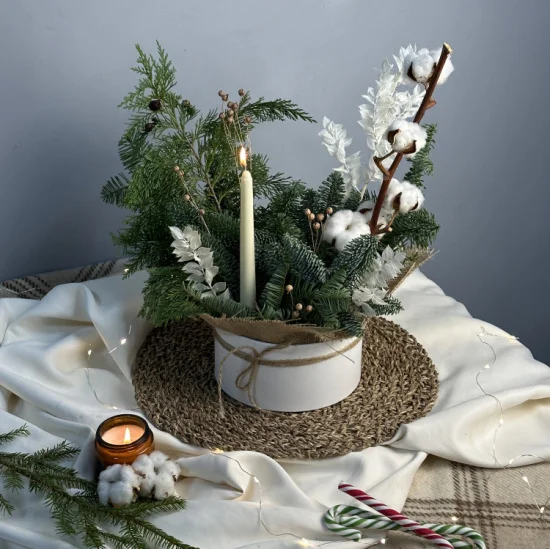 Теплые оттенки коричневого, зеленого и бежевого передают атмосферу зимнего вечера. Приглушенные тона сухоцветов, фактура хвои и мягкий свет свечи создают ощущение домашнего тепла. Композиция выглядит естественно и стильно – как часть праздничного декора или самостоятельный акцент в интерьере.